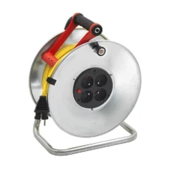 50m de câble jaune h05vv-f 3g1.5 – 1 fiche 2p+t 16a/230v~ – 4 prises 2p+t 16a/230v~ a clapets – disjoncteur thermique – puissance maxi : 3500w câble déroulé – 1000w câble non déroulé – protection enfants