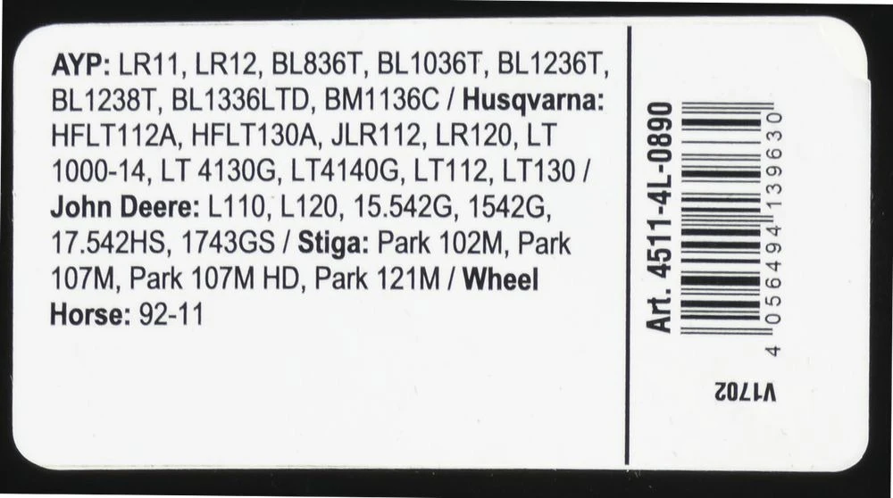 | husqvarna | 532 12 65-20 | hflt 112a, hflt 130a, jlr 112, lr 120, lt 112, lt 130, lt 1000-14, lt 4130g, lt 4140g |