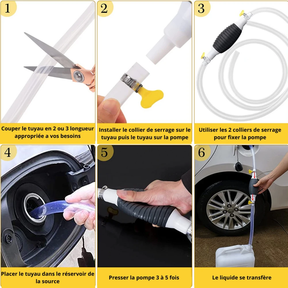 pompe manuelle : c’est l’accessoire idéal pour transverser un liquide. Sa conception spéciale, vous permettra de transférer vos carburants mais aussi tous autres liquides.gain de temps : cette pompe à siphon vous permettra de vider/remplir vos réservoirs en un instant, sans en renverser la moindre goutte sur vos sols.matériaux de haute qualité : le tuyau épais en pvc transparent de 2 mètres de long est résistant aux températures élevées.facile d’utilisation : il vous suffit de positionner les extrémités du tuyau là où vous le désirez et de presser la pompe pour attirer le liquide.le pack contient : un tuyau spécial liquide de 2 mètres + 2 colliers de serrage + une pompe