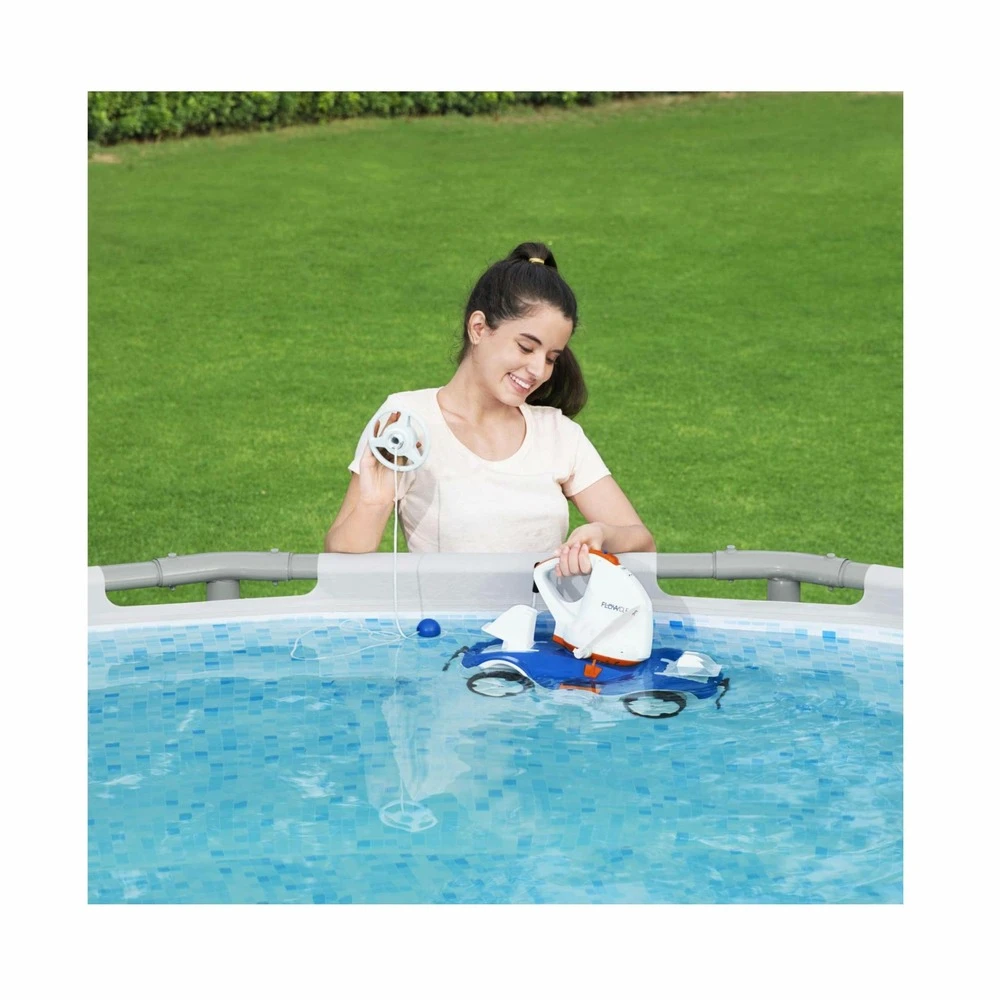 idéal pour nettoyer les piscines a fond plat avec superficie jusqu’à 45m² et aux parois non arrondies. Facile à utiliser, rechargez-le pendant 5h à 6h avant de le mettre en marche. Roues antidérapantes avec axe réglable. Capteur d’eau pour activer le démarrage automatique quand il entre en contact avec l’eau. Comptez 90 minutes pour un cycle de nettoyage. Bac de récupération avec filtre en acier de 4,5l. Très facile à nettoyer, il suffit de désarmer les clips de blocage. Poignée et lampe led pour l’utiliser la nuit.