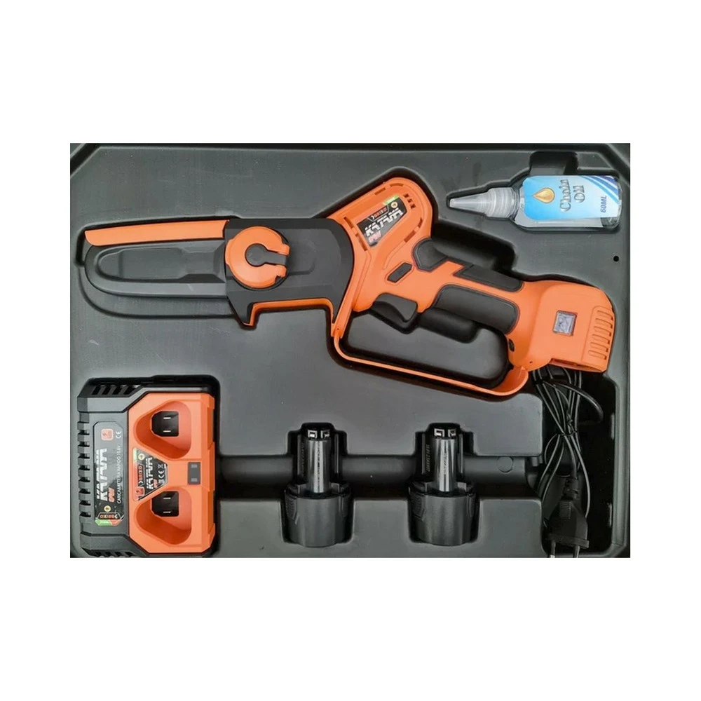 la machine est emballée dans une mallette contenant un chargeur double et deux batteries au lithium de 10,8 volts et 2,5 ah. Pratique, cela vous permet d’utiliser la scie d’élagage pendant que la deuxième batterie est en charge, vous pouvez terminer votre travail sans vous soucier de manquer d’énergie.
